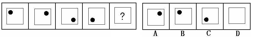 (答案:B。黑點在正方形中順時針移動。在第5個圖形中,應(yīng)該正好移動到左上角。)