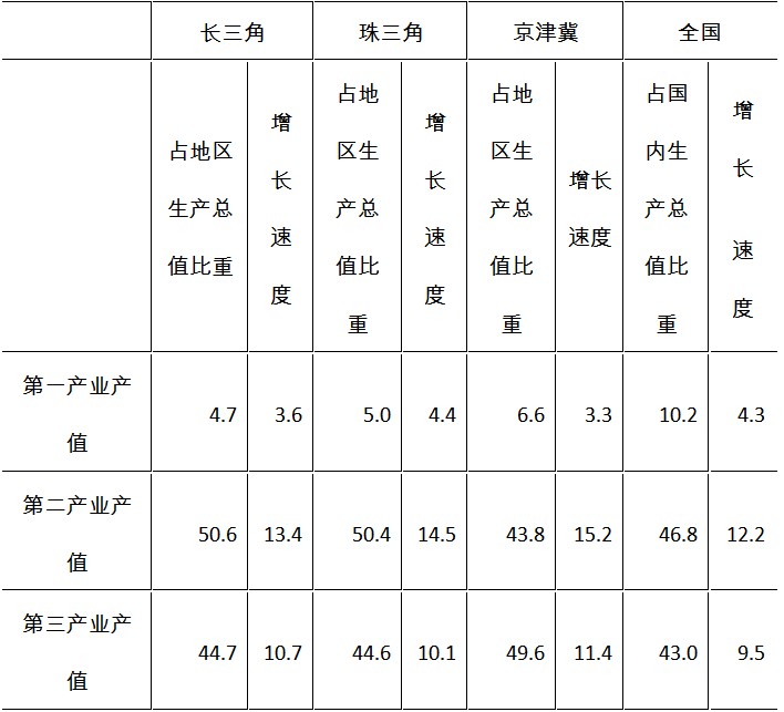 2010年三大經(jīng)濟圈產(chǎn)業(yè)結構及增長速度(%)